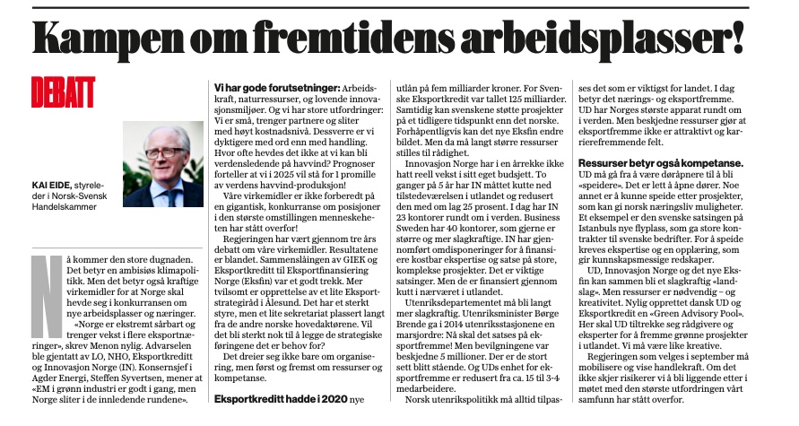 Dagens Industri 21-04-23 Tre områden kan vara draglok för norsk-svenskt samarbete: bygg och anläggning, hälsa och livsvetenskap samt energi. Nu vilar ansvaret på näringslivet, regeringarna samt svenska och norska myndigheter. Norge och Sverige går stärkta ur pandemin, tillsammans, skriver Ole Erik Almlid och Björn Rosengren. Förhållandet mellan Norge och Sverige är präglat av coronapandemin. Olika […]